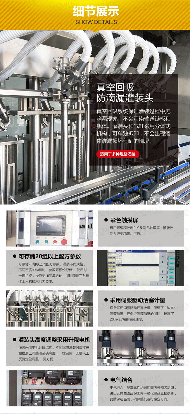 4、灌裝量調(diào)整方便,不需更換零配件,即可適用于不同規(guī)格的瓶子,調(diào)整方便,適應(yīng)性強(qiáng);