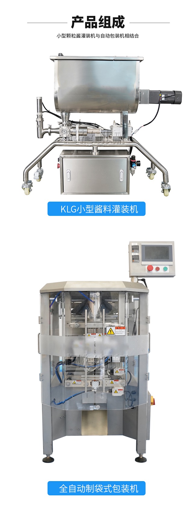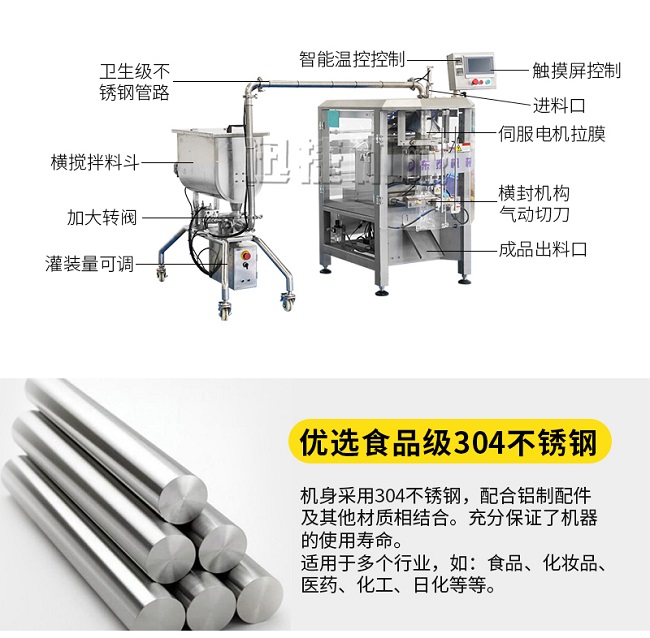 本機器主要用于調(diào)味品醬料的自動化包裝,機器安裝有橫向螺帶式攪拌,使油醬混合均勻,確保灌裝精度和產(chǎn)品包裝成品的均勻性。灌裝計量設備安裝有萬向輪,管路鏈接均采用快拆接頭,方便灌裝機拆卸移動清洗。包裝設備采用全伺服驅動器,包裝速度快,運行穩(wěn)定。設備構成組件:攪拌式定量灌裝機一臺管道鏈接組件2米。