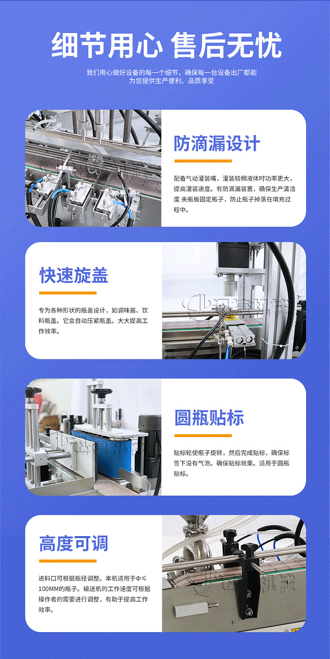 產品說明:生產線根據灌裝范圍選擇型號,灌裝部分為雙頭下潛式灌裝機,適用于不同物料不同瓶子的灌裝,配備自動壓蓋機和圓瓶貼標機,可實現不同蓋子的旋蓋貼標工作。 本設備主要適用于食品、日常化工、農藥、醫藥和特殊行業。灌裝精度將受氣壓的穩定性、物料的均勻性、灌裝速度等的影響。